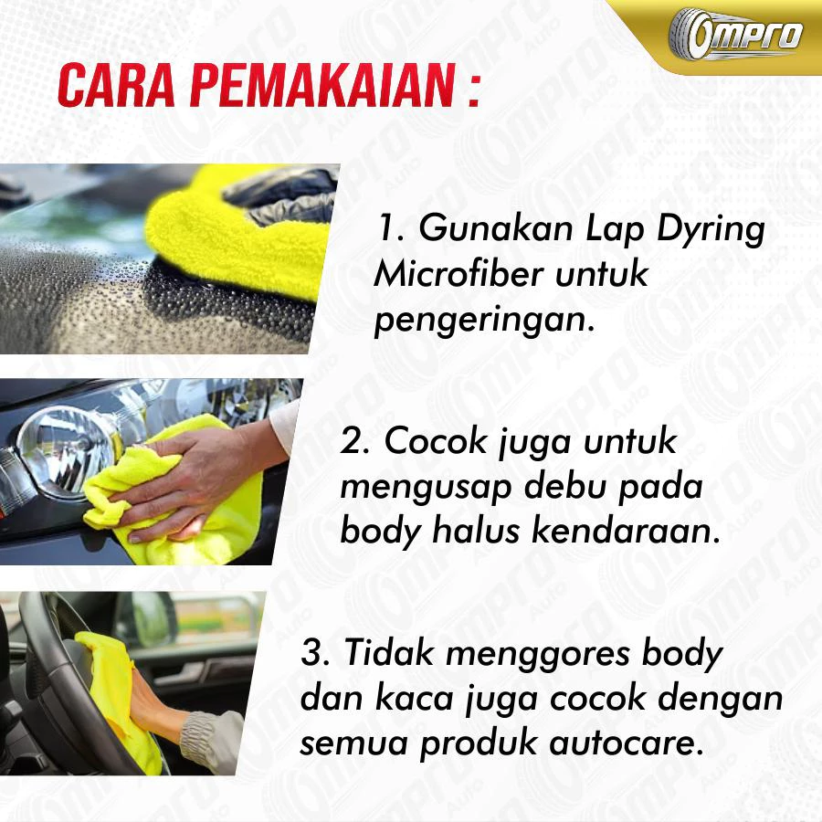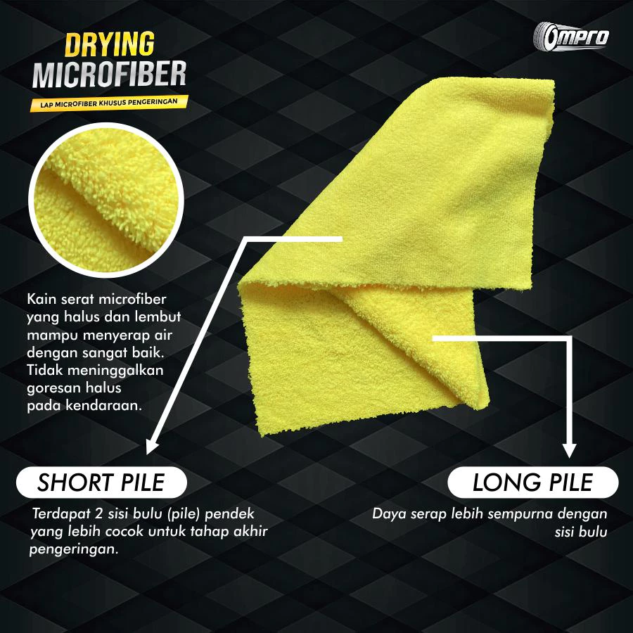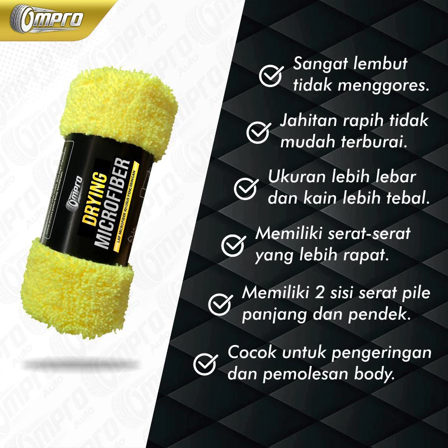 Dengan daya serap air yang luar biasa Ompro Drying Microfiber cocok untuk tahap pengeringan body motor / mobil setelah pencucian. Bulu-bulu halus dan tebal membuat Ompro Drying Microfiber aman untuk body halus dan kaca sebab tidak akan membuat goresan halus dipermukaannya.
